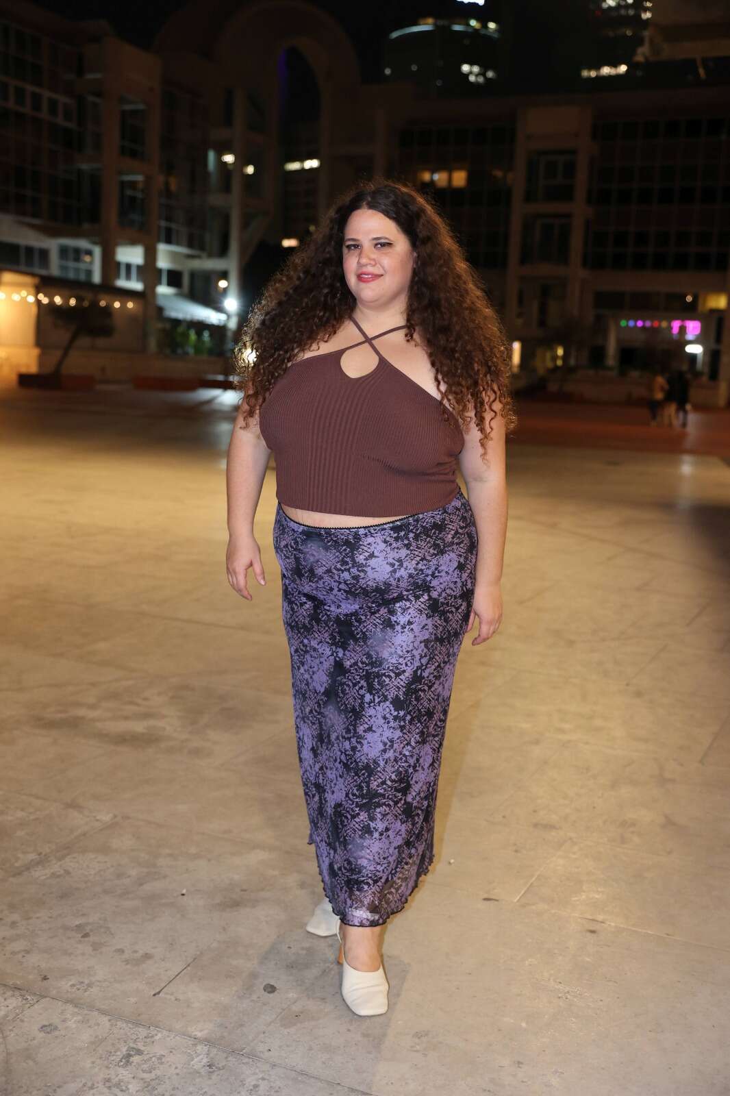 לעומתה, השחקנית המוכשרת מיה לנדסמן בטוטאל לוק שלא מתחבר, כל פריט מסיפור אחר. לנדסמן לבשה חצאית ארוכה ומבריקה בצבעי שחור וסגול בהיר, טופ סריג חום עם קשירת איקס שיוצרת חיתוך באזור החזה ונעליים לבנות אלגנטיות עם קצה ישר. החצאית בסגנון רומנטי, הטופ ספורטיבי והנעליים אלגנטיות - לא בדיוק שילוב מתאים.