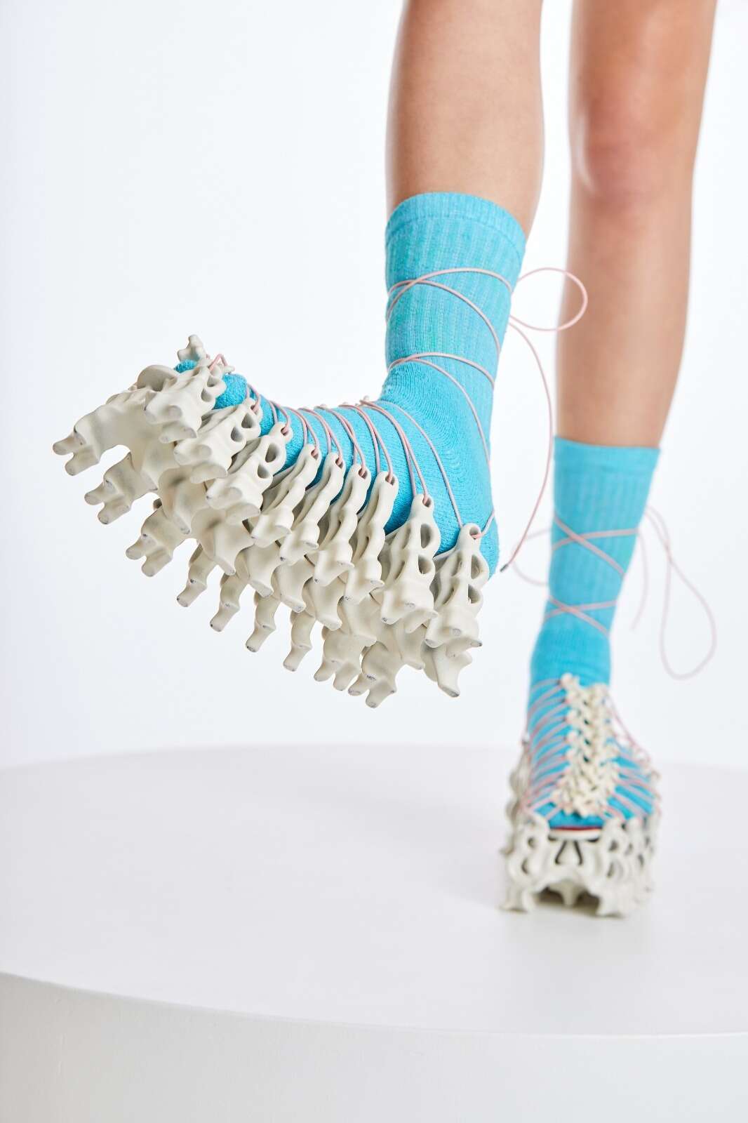 מעין גולדברג הציגה חדשנות מרשימה עם שני דגמים בפרויקט "Echoes of Humanity", המשקף את המתח שבין האנושי למלאכותי בעידן הבינה המלאכותית. נעליה, המודפסות בתלת-ממד, משלבות מחברים אנטומיים היוצרים תחושת חוסר יציבות מכוונת.