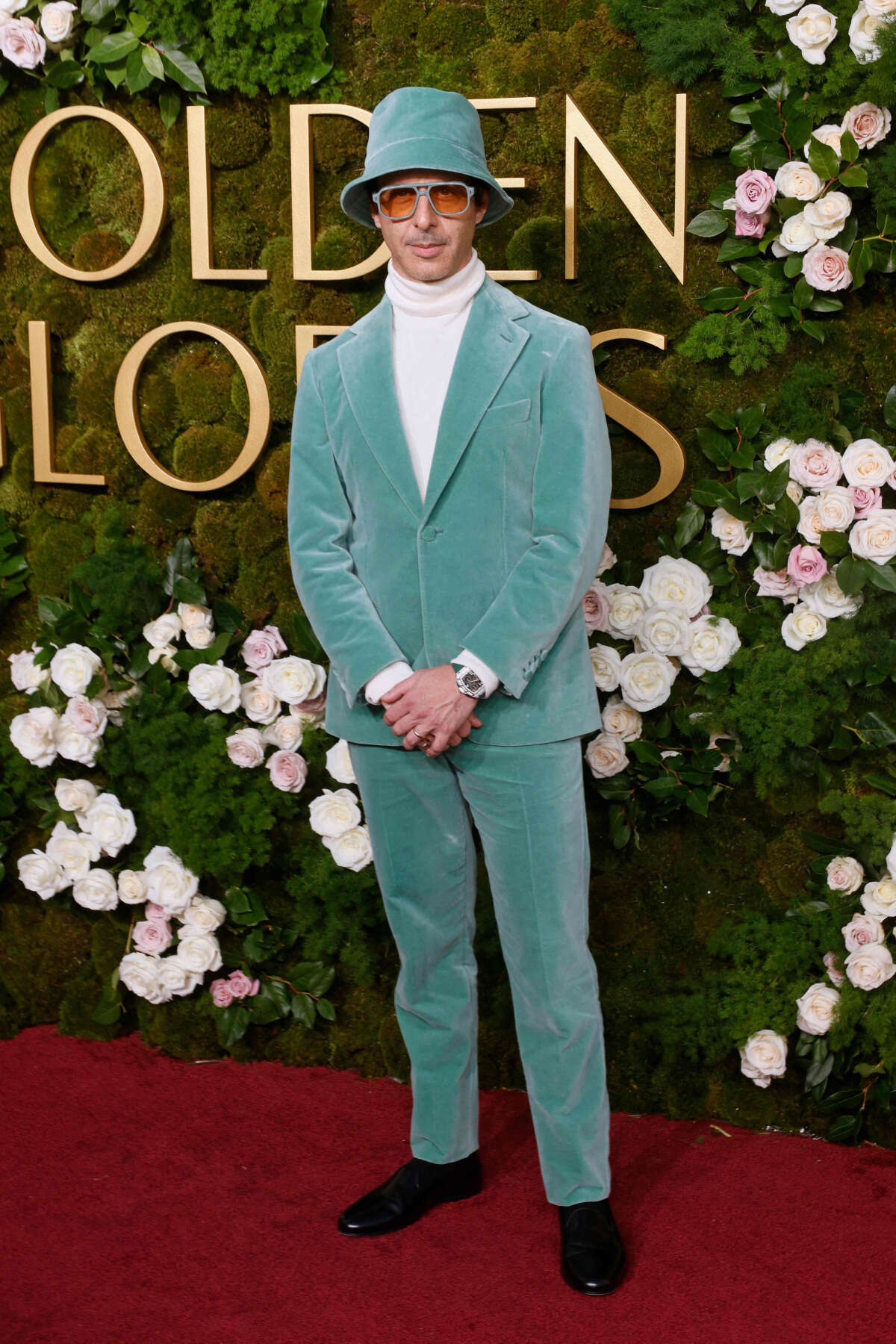 ומה עם הגברים? השחקן ג'רמי סטורנג, מ"היורשים", הלך על קטיפה בצבע ירוק של לורו פיאנה עם כובע תואם.
