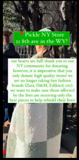 החנות נשארה איתנה במדיניות "לא לאופנה מהירה" למרות השריפות הקטסטרופליות בהן אלפי תושבי לוס אנג'לס איבדו הכל. החברה כתבה באינסטגרם: "חשוב שתתרמו רק פריטים איכותיים, איננו מקבלים יותר מותגי אופנה מהירה (זארה, H&M, Edikted וכו'). אנחנו רוצים להבטיח שהנפגעים מהשריפות מקבלים רק את הפריטים הטובים ביותר כדי לבנות מחדש את חייהם".