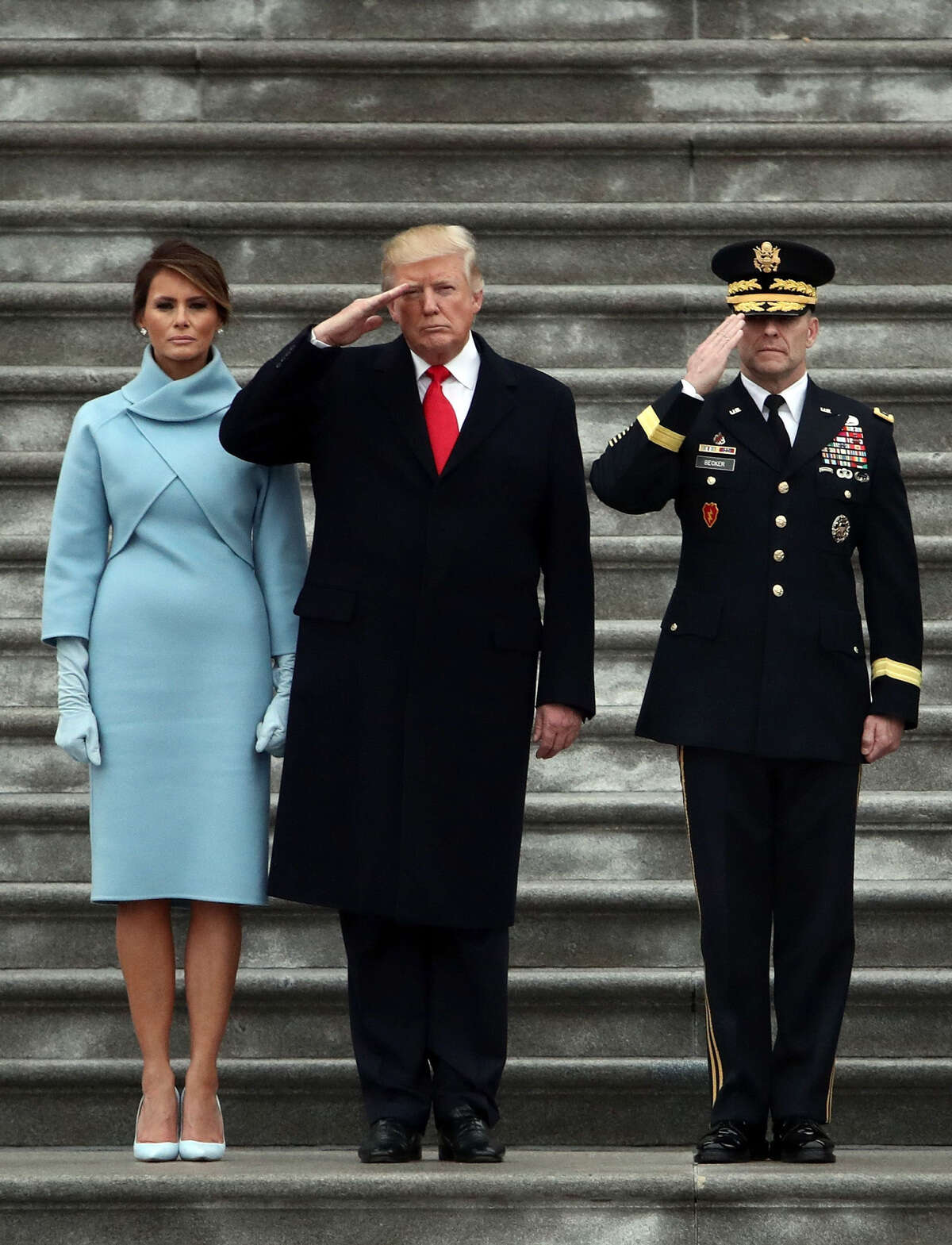 להשבעת בעלה כנשיא, מלניה לבשה שמלה תכולה בהזמנה אישית מבית ראלף לורן, העשויה מקשמיר, בשילוב כפפות ונעלי עקב תואמות. זו הייתה הצהרת האופנה הראשונה שלה כגברת הראשונה וקבעה את הטון למלתחה שלה לאורך כהונתו הראשונה של בעלה.