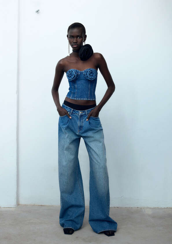 מחוך ג'ינס עם אפליקציית ורדים, מחיר: 449 שקלים, ג'ינס רחב, מחיר: 549 שקלים / יח"צ