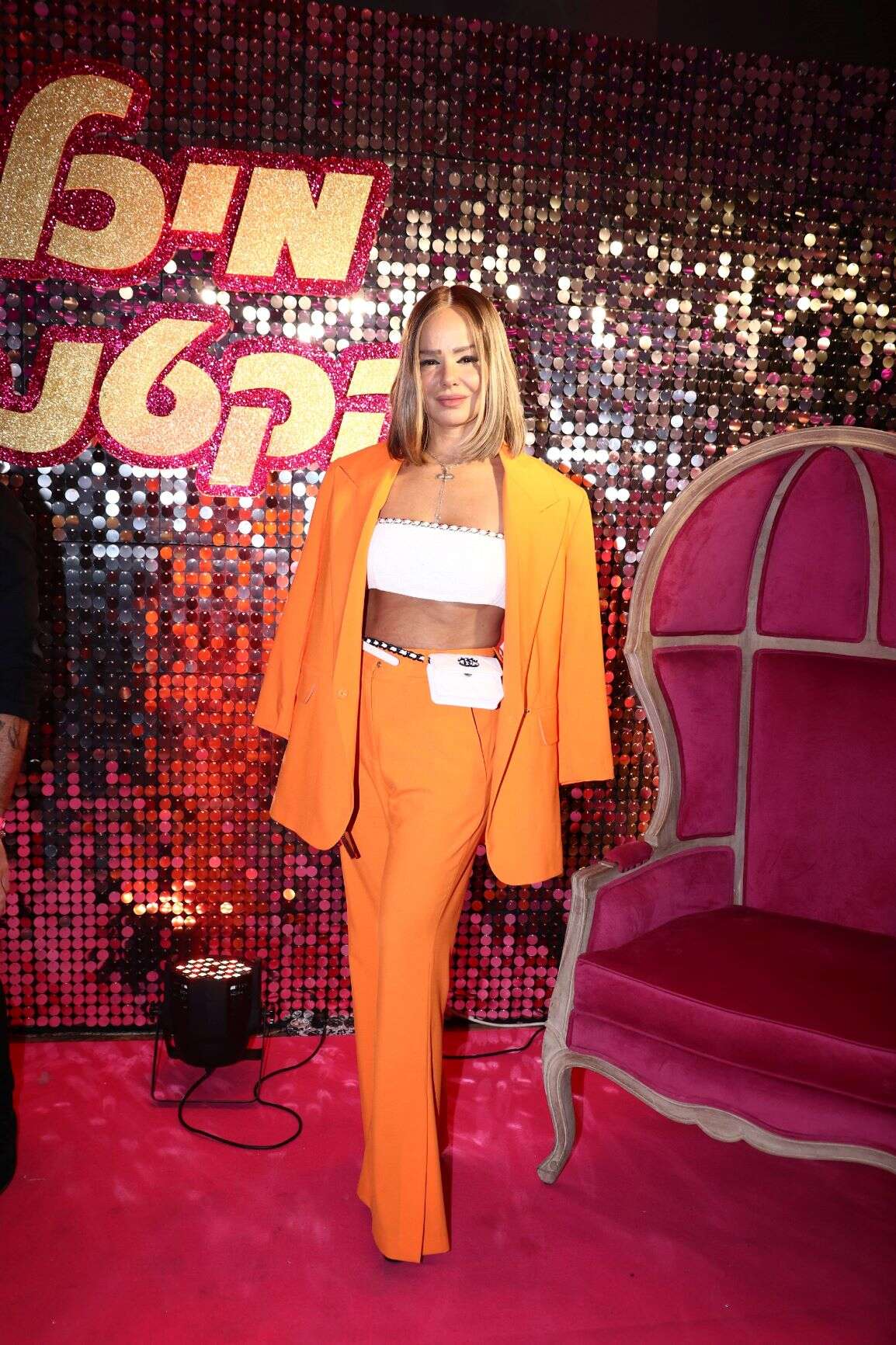 אירית רחמים במראה של נערת תפוזינה. היא לבשה חליפה כתומה וטופ לבן מתחת עם חגורה של שאנל בגוון תואם. הז'קט שהונח לאורך כל הערב על הכתפיים כשכמיה הוריד מהסטייל שהיה יכול להיות מושלם.