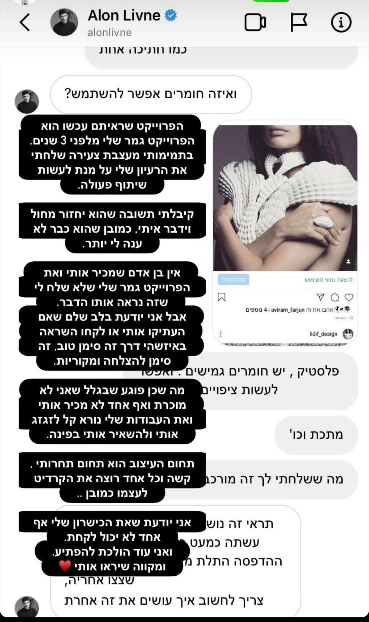 "בתמימותי, כמעצבת צעירה, שלחתי את הרעיון שלי על מנת לעשות שיתוף פעולה. קיבלתי תשובה שהוא יחזור מחו״ל וידבר איתי. כמובן שהוא לא ענה לי יותר. אין בן אדם שמכיר אותי ואת פרויקט הגמר שלי שלא שלח לי שזה נראה אותי הדבר", כתבה.