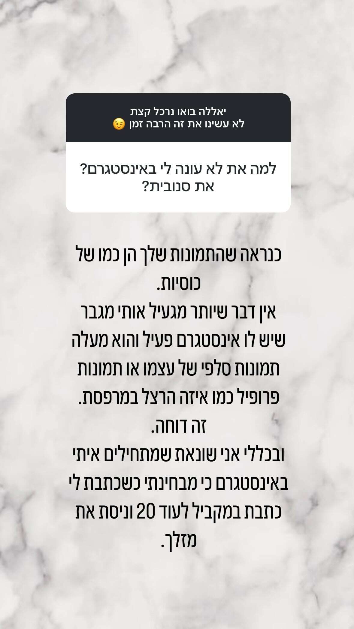 "יאללה, בואו נרכל קצת, לא עשינו את זה הרבה זמן", פתחה מעיין את הסשן, כשאחת השאלות הראשונות שנשאלה הייתה ישירה – וככזו, גם זכתה לתשובה תקיפה: "למה את לא עונה לי באינסטגרם, את סנובית?", תהה גולש. "כנראה שהתמונות שלך הן כמו של כוסיות", כתבה מעיין, והוסיפה: "אין דבר שיותר מגעיל אותי מגבר שיש לו אינסטגרם פעיל והוא מעלה תמונות סלפי של עצמו או תמונות פרופיל כמו איזה הרצל במרפסת. זה דוחה. בכללי, אני שונאת שמתחילים איתי באינסטגרם, כי מבחינתי כשכתבת לי – כתבת במקביל לעוד 20 וניסית את מזלך".