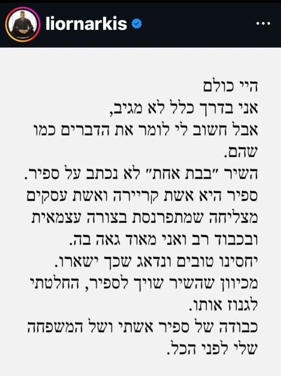 בהודעה שפרסם בחשבון האינסטגרם שלו, הבהיר נרקיס: "השיר בבת אחת לא נכתב על ספיר. ספיר היא אשת קריירה ואשת עסקים מצליחה שמתפרנסת בצורה עצמאית ובכבוד רב, ואני מאוד גאה בה. יחסינו טובים ונדאג שכך יישאר. מכיוון שהשיר שוייך לספיר, החלטתי לגנוז אותו. כבודה של ספיר אשתי ושל המשפחה שלי לפני הכל".