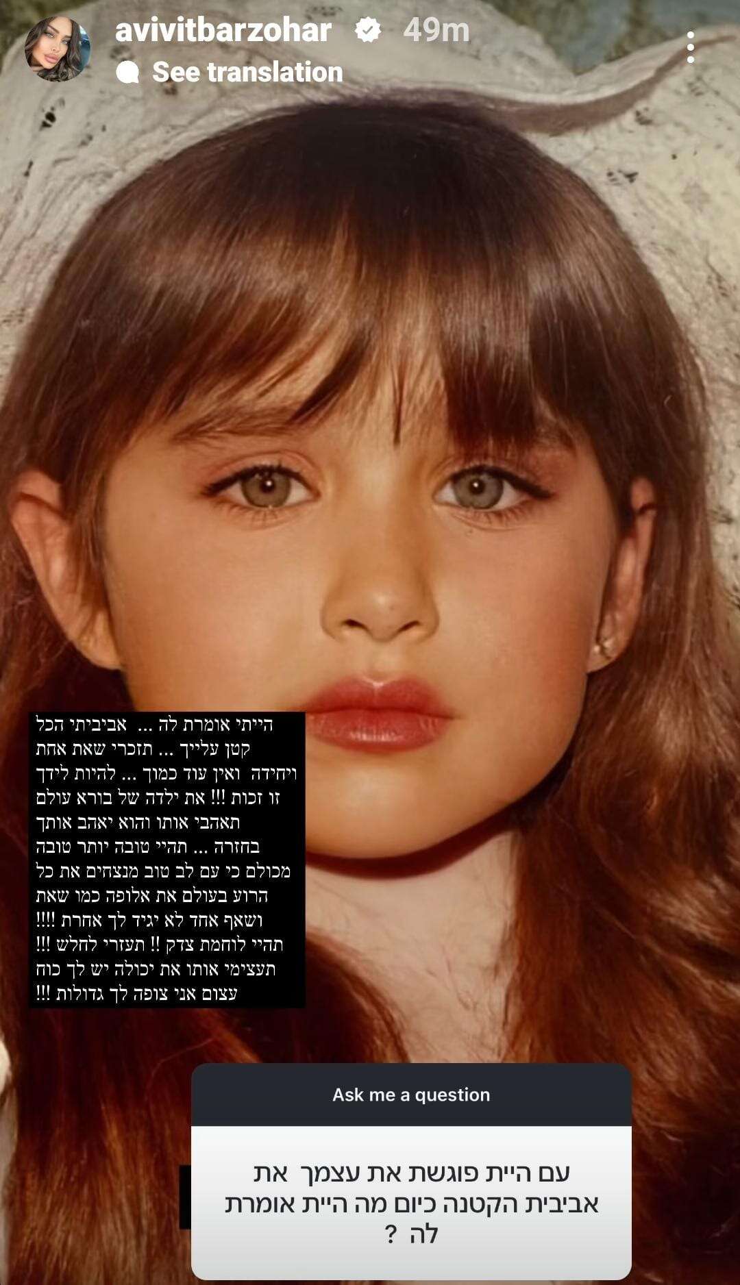 בהמשך נשאלה מה הייתה אומרת לאביבית הקטנה לו הייתה פוגשת אותה היום והשיבה: "הייתי אומרת לה 'אביביתי הכל קטן עלייך. תזכרי שאת אחת ויחידה ואין עוד כמוך. להיות לידך זו זכות. את ילדה של בורא עולם. תאהבי אותו והוא יאהב אותך בחזרה. תהיי טובה יותר טובה מכולם, כי עם לב טוב מנצחים את כל הרוע בעולם. את אלופה כמו שאת ושאף אחד לא יגיד לך אחרת! תהיי לוחמת צדק! תעזרי לחלש! תעצימי אותו. את יכולה יש לך כוח עצום אני צופה לך גדולות".