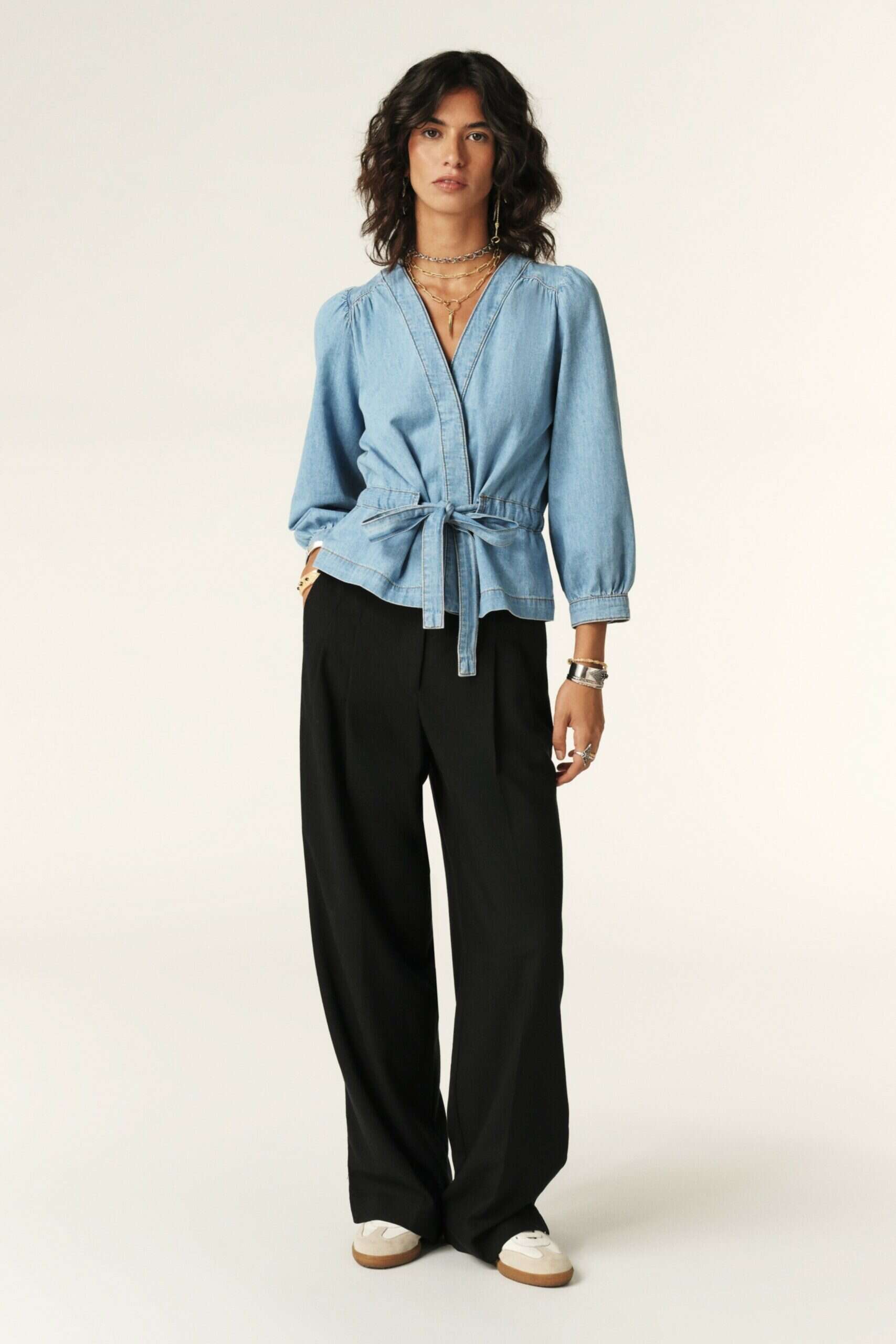 במותג האהוב BASH מצאנו אופציה לעליונית נהדרת מבד ג'ינס דק בסגנון שמשחק בין מעטפת לקימונו. מעבר להיותו פריט על זמני, הוא הכי שימושי בתקופת המזגנים.