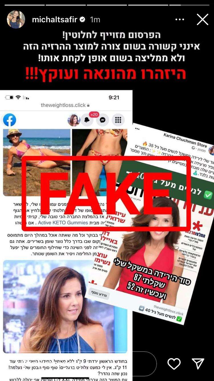 "ניסינו להבין מי עומד מאחורי זה, אבל מדובר בחברה מתוחכמת כי כשלוחצים על הלינק אתה לא מגיע למקום. אתה מגיע למישהו של מישהו של מישהו. הם מאוד מתוחכמים, אז אי אפשר לעלות עליהם. אתה יודע, אני לא אכנס עכשיו לתביעה ותלונה במשטרה ועל זה הם בונים. שאתה לא תשקיע זמן וכסף בלתפוס אותם. אבל אנשים שמחפשים קיצורי דרך, והם לא מעט, נופלים בפח הזה. המינימום שאני יכולה לעשות זה להבהיר מצדי שאין לי שום קשר לדבר הזה".