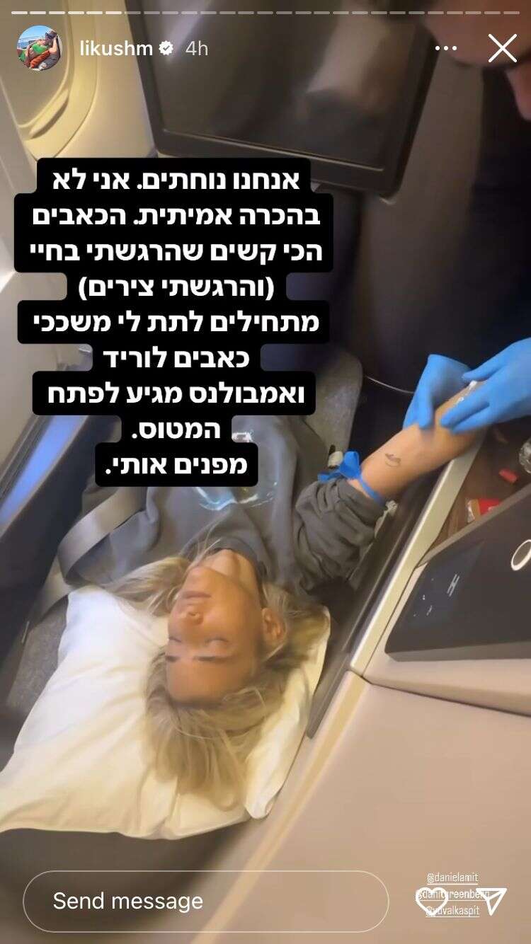 בהמשך שיתפה בדרמה שהתרחשה בזמן הטיסה. "המראנו מבנגקוק לתל אביב. חצי שעה לפני הנחיתה קמתי מכאב בכל הגוף, שלא הרגשתי בחיים שלי. אני בטוחה שאני מתה במקום. אני מתעלפת. מכאן התחיל סיוט. לא הצלחתי לנשום. הגוף שלי בסכינים. מגיע חובש של המטוס, כולי זיעה קרה. הקברניט, הדיילות, הבנות, כולם עליי".