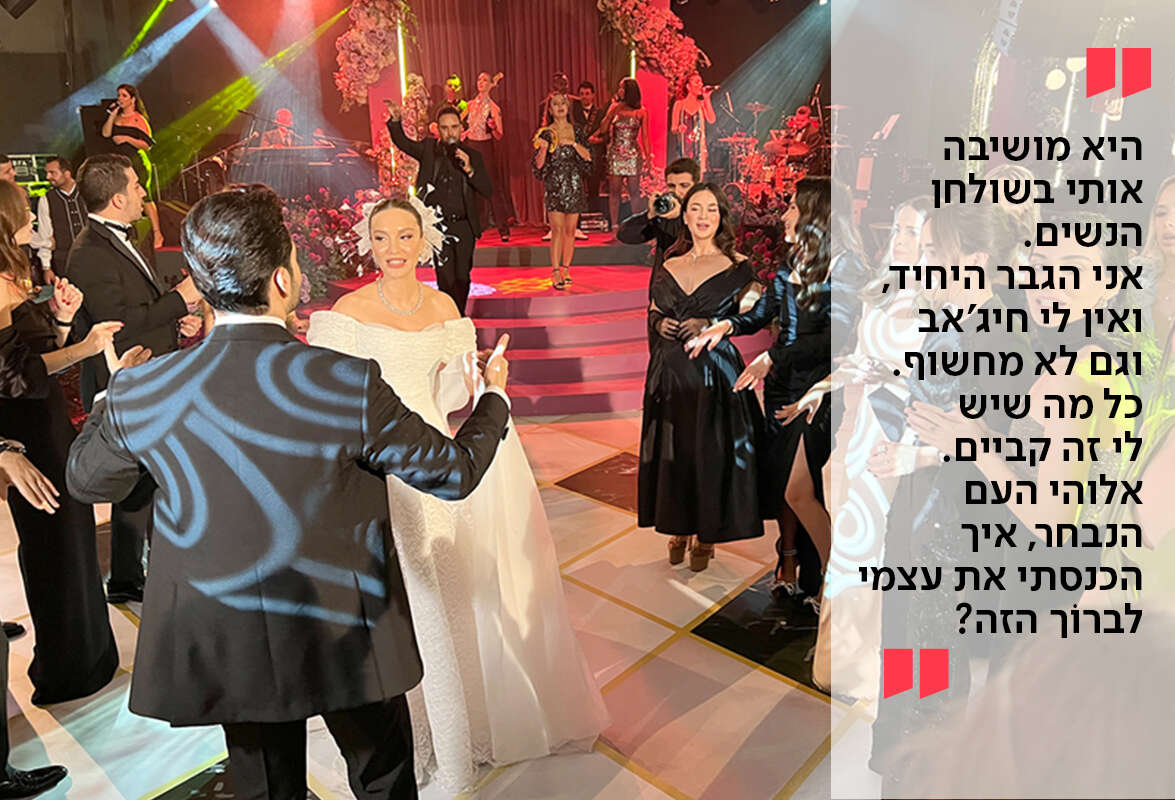 היא מושיבה אותי ליד שולחן נשים. זהו שולחן ארוך במיוחד, שבו חלק מהנשים עוטות חיג'אב אך אחרות מציגות מחשוף נדיב. אני הגבר היחיד בשולחן, ואין לי חיג'אב וגם לא מחשוף. כל מה שיש לי זה קביים. אלוהי העם הנבחר, איך הכנסתי את עצמי לברוֹך הזה?