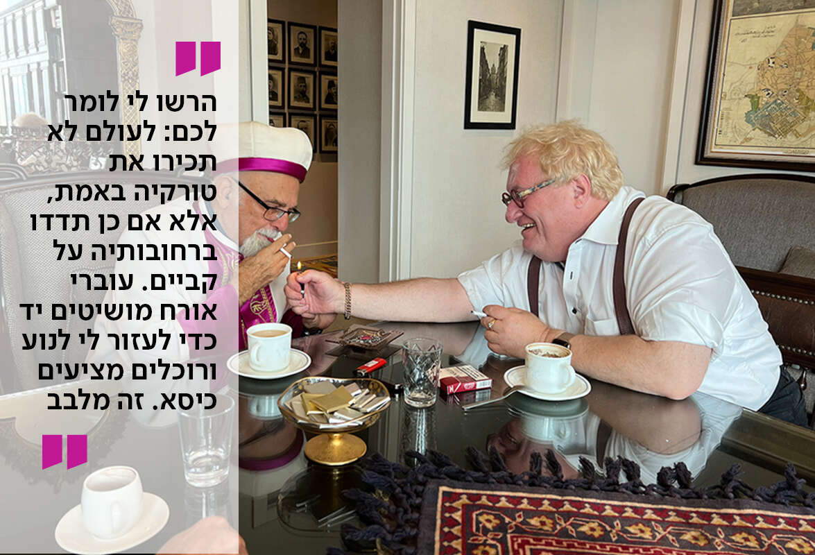 ואחרי שיצאה לה השבת אני שם פעמיי ללשכת הרב הראשי לטורקיה, הרב יצחק חלבה. אנו נפגשים במשרד ה"זמני" של הרבנות, ששוכן כבר כשנתיים בבניין משרדים יוקרתי. מדובר ביהודי חכם, מצחיק ומלא חיים, שבגדיו מסורתיים וצבעוניים. אנו מעשנים יחד כעשר סיגריות בתוך פחות משעה, בעוד אני לוגם להנאתי קפה טורקי טעים מספל בגודל אקסטרה לארג'.