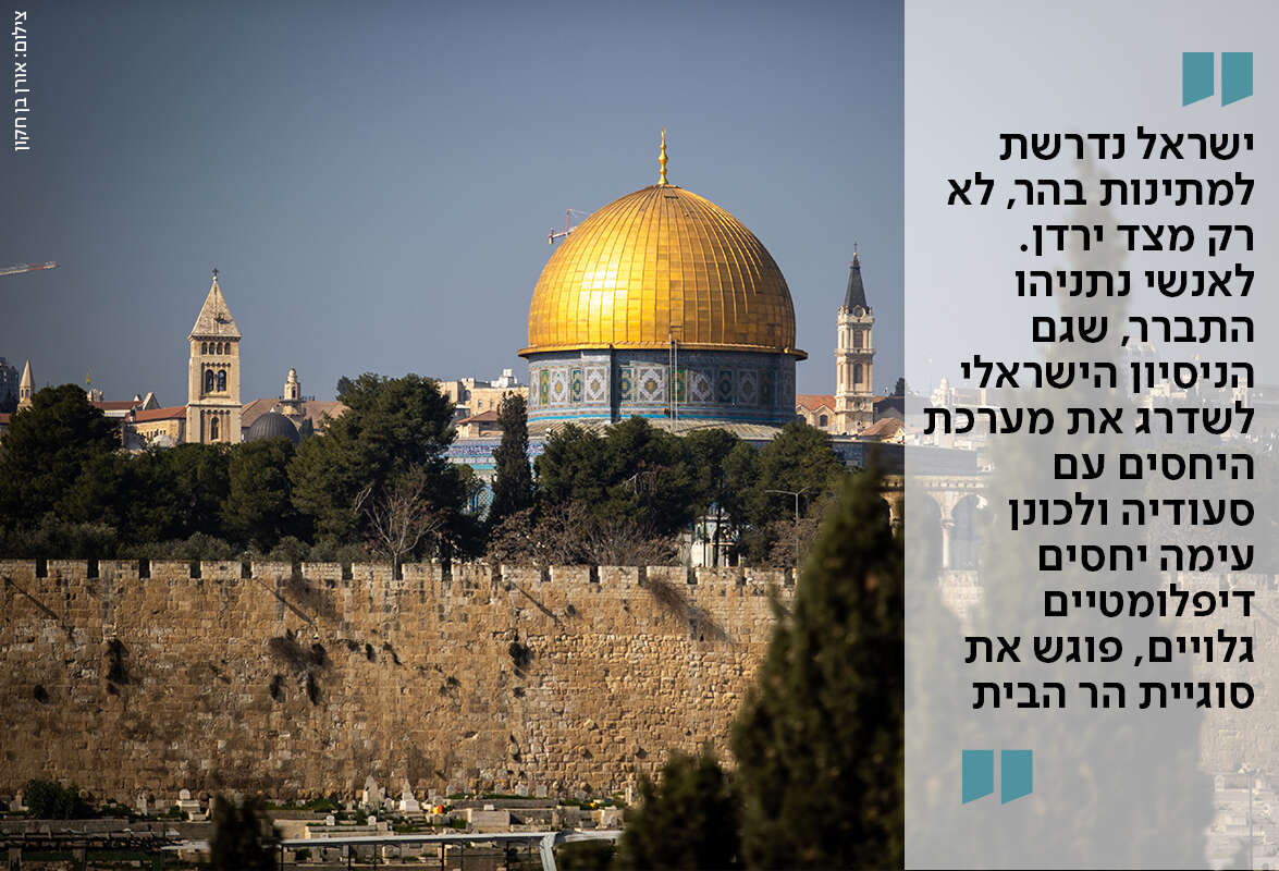 ישראל נדרשת למתינות בהר הבית לא רק על ידי ירדן. בשבועות האחרונים התברר שוב לאנשי נתניהו, שגם הניסיון הישראלי לשדרג את מערכת היחסים עם סעודיה ולכונן עימה יחסים דיפלומטיים גלויים, פוגש את סוגיית הר הבית. הסעודים הבהירו לישראל ולארה"ב כי כאשר תבשיל השעה, תידרש ישראל בין היתר לדאוג לכך שהמצב הנוכחי בהר יוקפא, ושתפילות היהודים שם יישארו בצל ובצמצום. סעודיה, שמעו פקידים ישראלים, אולי השלימה עם ההגמוניה ועם האפוטרופסות הירדנית באל־אקצא, אבל אינה יכולה להעניק לגיטימציה לנראות היהודית הגוברת שם, בביקורים ובתפילות.