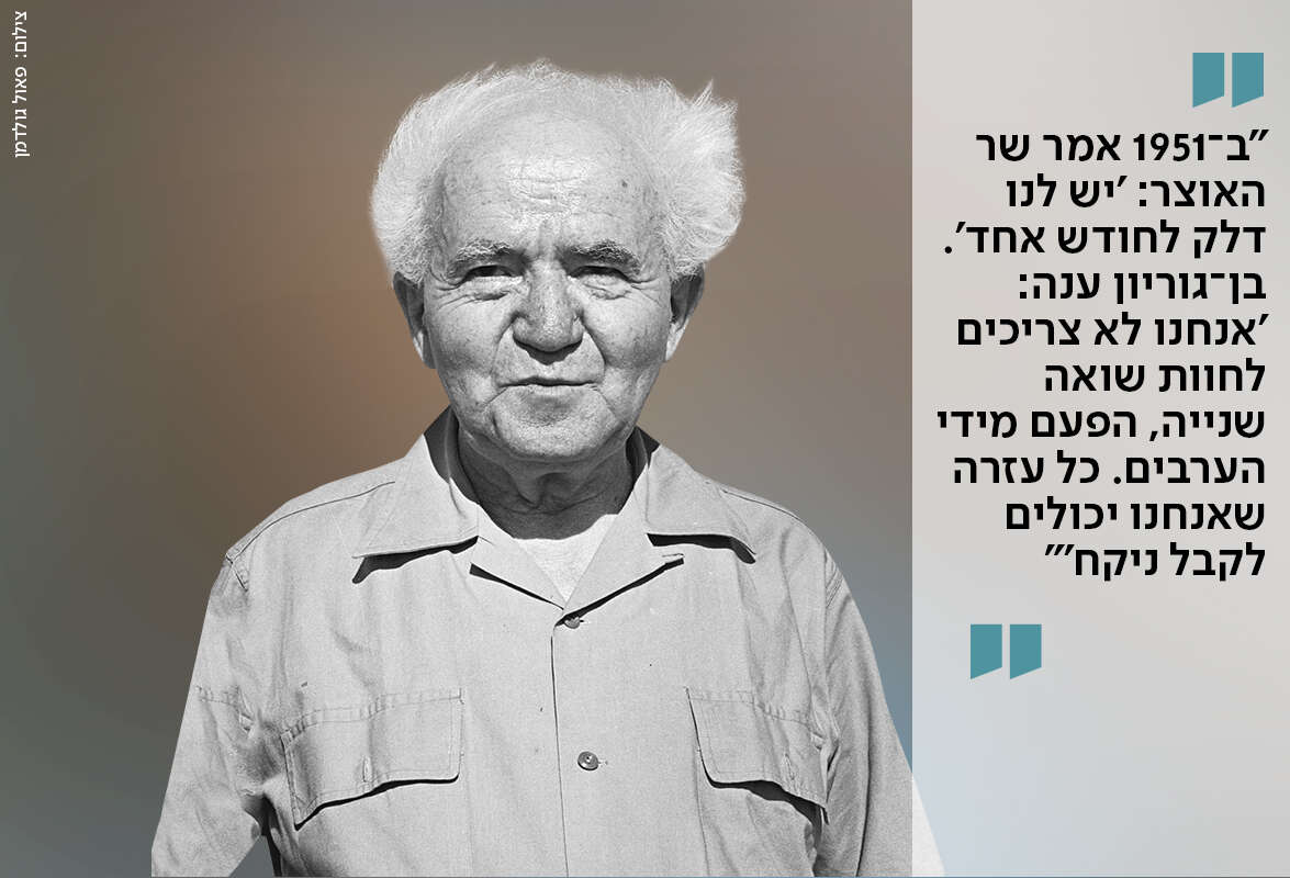 "היו שתי תפיסות עולם: זו של בן־גוריון, הפרגמטית והריאלית, שאומרת שצריך לקומם את מדינת ישראל שהיתה אז במצב הנורא ביותר בתולדותיה, מול התפיסה הרגשנית־ערכית של בגין. באחת מישיבות הממשלה ב־1951 שר האוצר אליעזר קפלן אמר: 'יש לנו דלק לחודש אחד'. כלומר, שאחרי חודש לא ניתן היה להפעיל מפעלים, חקלאות, צבא. בעצם אין מדינה. בן־גוריון אמר: 'אנחנו לא צריכים לחוות שואה שנייה, הפעם מידי הערבים. כל עזרה שאנחנו יכולים לקבל ניקח כדי לבנות את המדינה'.