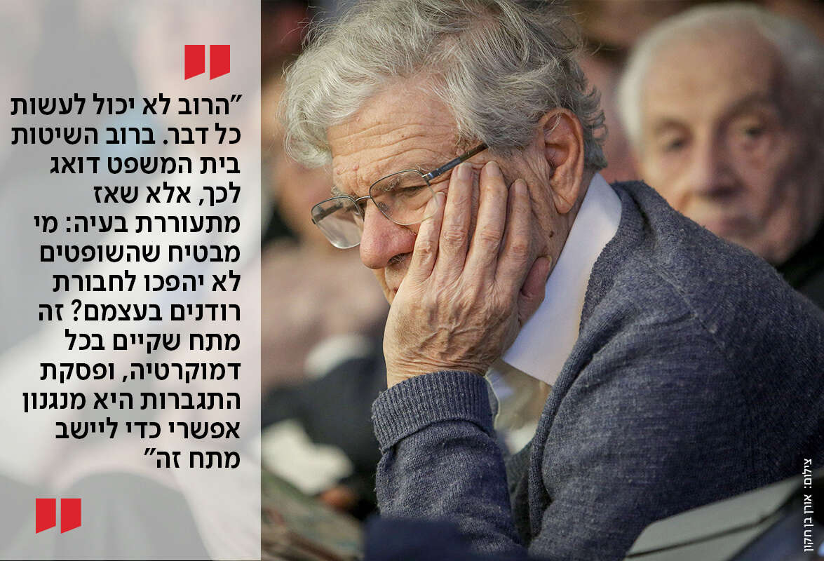 "אתה צודק. נוסף על כך, הכרעה של בית משפט נראית יפה, נקייה, יש שופטים מכובדים עם גלימות באולם. לעומת זאת, הפוליטיקה מלוכלכת ומסריחה, הדימוי של מרכז הליכוד, הדילים. אבל זו דמוקרטיה. מרכז הליכוד הוא יותר דמוקרטי מבג"ץ. אני לא אוהב את המרכז הזה, אבל ראה את ועידת הליכוד, זו הדמוקרטיה. כשבית משפט מתערב הוא מחליש את אותם מנגנוני ביקורת חלופיים. חוק הגיוס, למשל - משפטנים נוטים להניח שאפשר ללכת לבג"ץ כדי שייתן פתרון. זו אשליה ובטח בבעיות רוחב חברתיות. בג"ץ לא יכול לכפות על עשרה אחוזים מהאוכלוסייה לשנות את אורחות חייה".