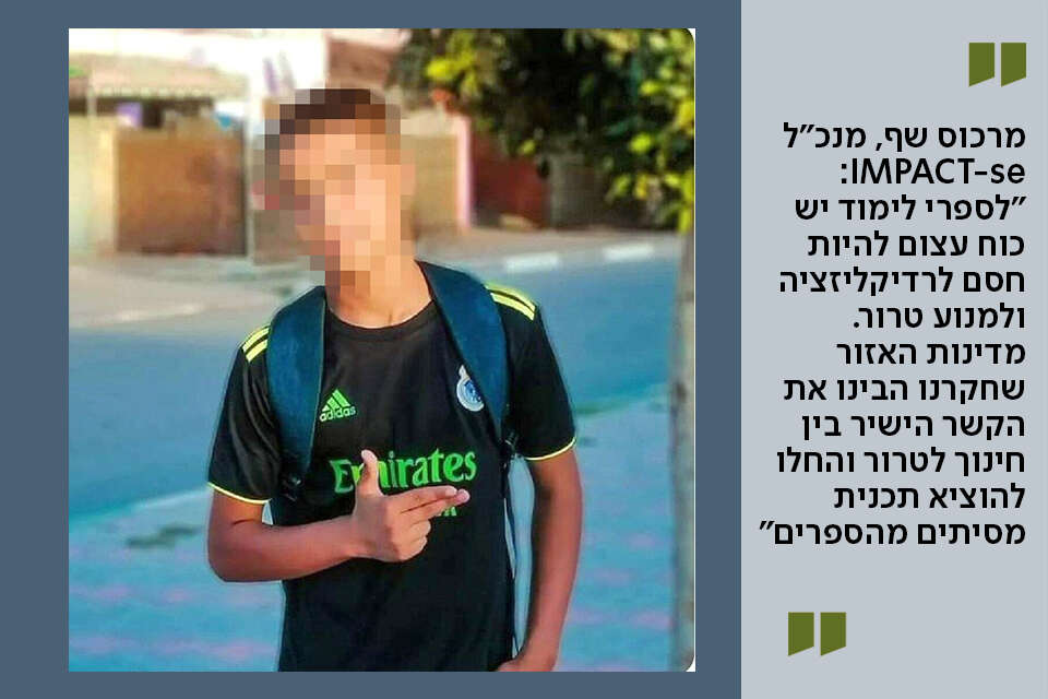 המכון ערך מחקר מקיף על כל ספרי הלימוד שהוציא משרד החינוך של הרשות הפלשתינית, גם אלו שיצאו ב־2018 במסגרת תוכנית הלימודים החדשה. "החלטנו להיכנס בעובי הקורה ולהבין אילו שינויים נעשו בספרי הלימוד", מספר אריק אגסי, סמנכ"ל IMPACT-se, "מצאנו מחיקה של כל אזכור שהיה בספרים על ניסיונות להגיע לשלום עם ישראל, והכנסת כמות הרבה יותר גדולה של תכנים אלימים ואנטישמיים ממה שהיה בעבר. המחבל בן ה־13 הוא תוצר של תוכנית הלימודים הזו, ואני חושש מאוד שהוא מבשר לנו על גל חדש של פיגועים על ידי קטנים".