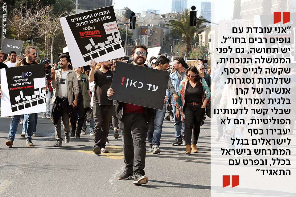 "יש תחושה, עוד לפני הממשלה הנוכחית, שקשה יותר לגייס כסף, שדלתות נסגרות בפנינו. אנשיה של קרן בלגית אמרו לנו לא מזמן שבלי קשר לדעותינו הפוליטיות, הם לא מתכוונים לתת יותר כסף לישראלים - בגלל מה שקורה בישראל בכלל, ובשל מה שמתרחש בתאגיד בפרט. בסוף אנחנו מייצגים את ישראל בעיני העולם, בלי קשר לדעותינו הפוליטיות".