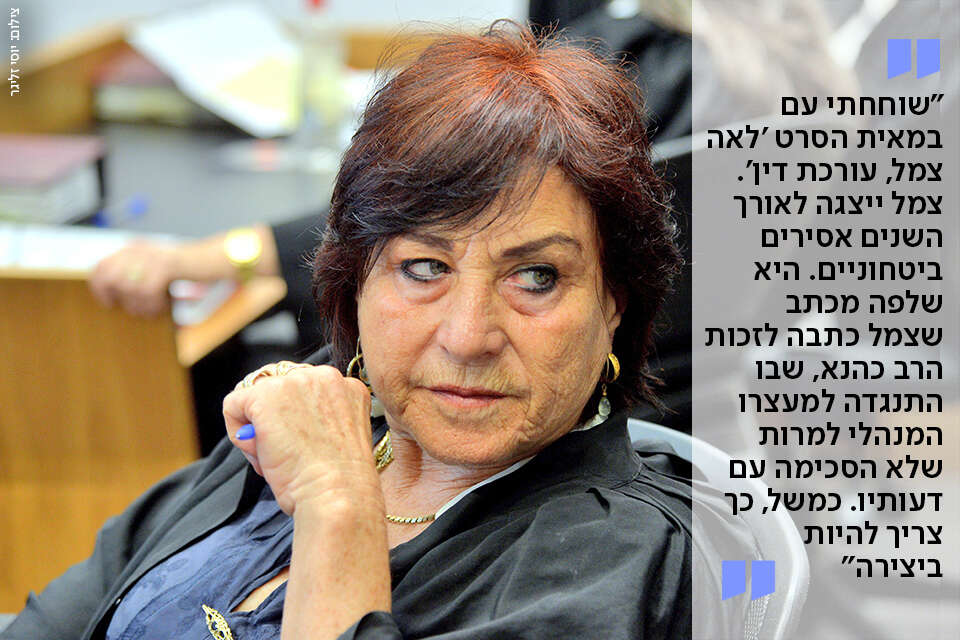 "תרבות ישראלית היא קריטית, ועליה להיות נטולת קריטריונים פוליטיים. שוחחתי לא מזמן עם הבמאית רחל לאה ג'ונס, שביימה את הסרט 'לאה צמל, עורכת דין'. צמל, שעדיין פעילה, ייצגה בבתי משפט במשך חמישה עשורים, אסירים ביטחוניים ופלשתינים המואשמים בפעולות טרור. באמצע השיחה שלנו שלפה ג'ונס מכתב שלאה צמל כתבה לזכות הרב כהנא, שבו הביעה התנגדות למעצרו המנהלי ב־1980.