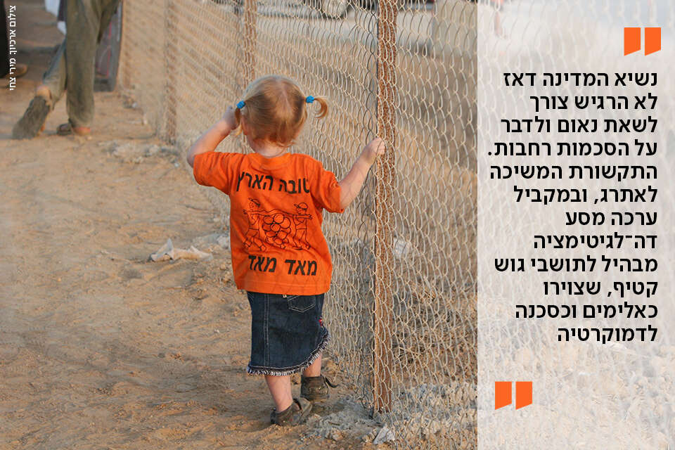 אז לא קמו כל מיני פורומים של יפי נפש שפרסמו שלטים מרשימים ברחבי ישראל ובעיתונות עם קריאה להידברות. גם נשיא מדינת ישראל דאז לא הרגיש צורך לשאת נאום ולדבר על הסכמות ציבוריות רחבות. התקשורת המשיכה לאתרג, ובמקביל ערכה מסע דה־לגיטימציה מבהיל לתושבי גוש קטיף, שצוירו כהזויים, כאלימים וכסכנה לדמוקרטיה. היתה באוויר אפילו שמחה לאיד. אנשים שמתנגדים בכל מחיר לטרנספר של ערבים עלצו על גירוש יהודים.
