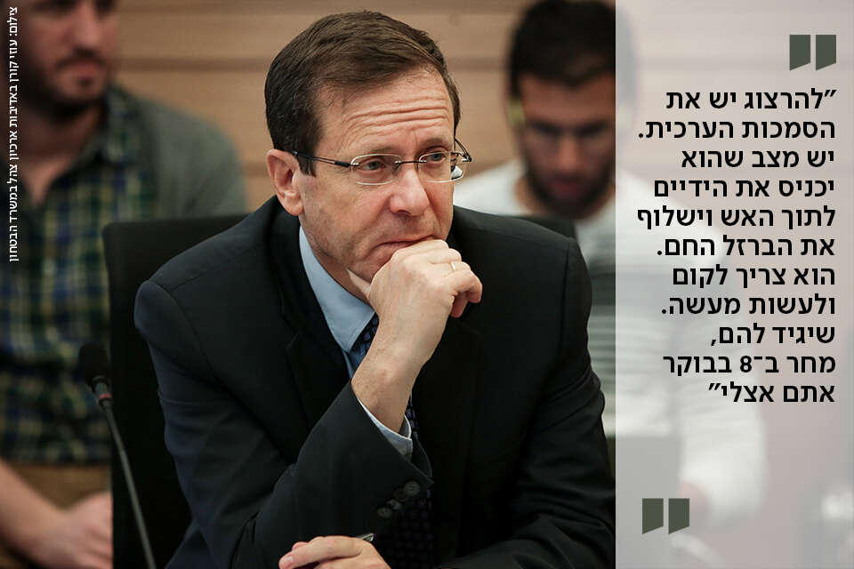 "כן. והוא ייזכר בכל ימי העם, מהסנהדרין ועד היום. יזכרו את בוז'י הרצוג. יש לו את הסמכות לתת את המנדט לראש הממשלה, ויש לו גם את הסמכות הערכית. הוא עומד מעל כל העם, אז יש מצב שהוא יכניס את הידיים לתוך האש וישלוף משם את הברזל החם הזה. הוא צריך לקום ולעשות מעשה".