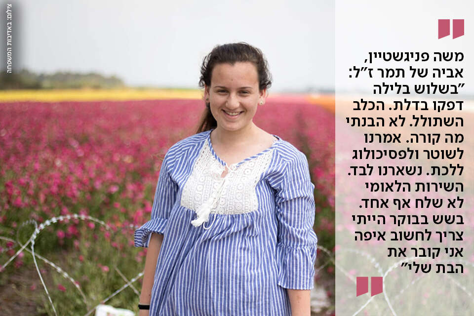 "בשלוש בלילה, כמו בסרט אימה, דפקו בדלת. לא שמענו כלום, עד שהכלב התחיל להשתולל ולנבוח. פתחתי את הדלת, ואני רואה מולי שוטר ואדם נוסף. לא הבנתי מה קורה. השוטר בקושי ידע עברית. גם הפסיכולוג שלידו היה אובד עצות. לא הבנתי כלום. לקח זמן עד שהבנו שזו תמר. הלם. בכי. צעקות. השוטר והפסיכולוג היו חסרי אונים, לא הציעו שום עזרה, אז אמרנו להם ללכת. נשארנו לבד. השירות הלאומי לא התקשר, לא שלח אף אחד. בשש בבוקר הייתי צריך לחשוב איפה אני קובר את הבת, איך אני מדפיס מודעות אבל, מאיפה אני משיג אוטובוסים. שאלתי את עצמי איך זה יכול להיות? הבת שלי שייכת למסגרת מסוימת, הקדישה את זמנה למדינה, אז איך אף אחד לא מרים טלפון?".