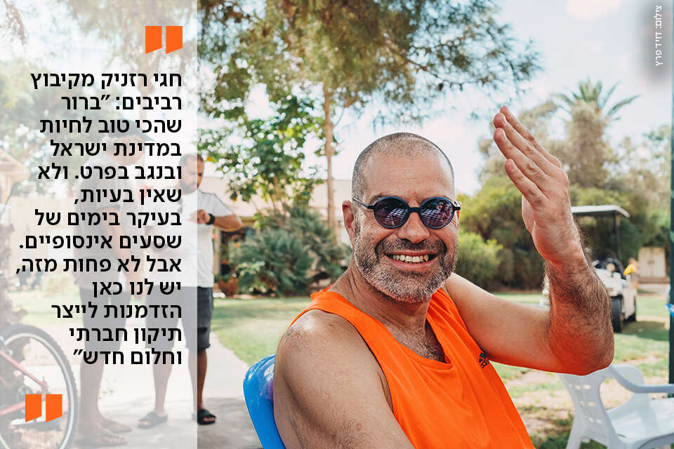 "ברור שהכי טוב לחיות כאן במדינת ישראל, ובנגב בפרט! ולא שאין בעיות, בעיקר בימים של שסעים אינסופיים. אבל לא פחות מזה, יש לנו כאן הזדמנויות לייצר תיקון חברתי וחלום חדש לנגב ולמדינת ישראל. ולמה טוב לי לחיות כאן? כי הלמה שלי מורכב ממשמעות. משמעות לעשות שינוי. כשאני וחבריי, יהודים ובדואים, עושים פיתוח כלכלי־חברתי משותף, אני אומר לך מניסיון שהכל אפשרי. אני גר בקיבוץ רביבים, אחת משלוש הנקודות הראשונות בנגב, ויודע שכמו שהחלוצים חלמו והגשימו, גם לנו מותר", אומר חגי.