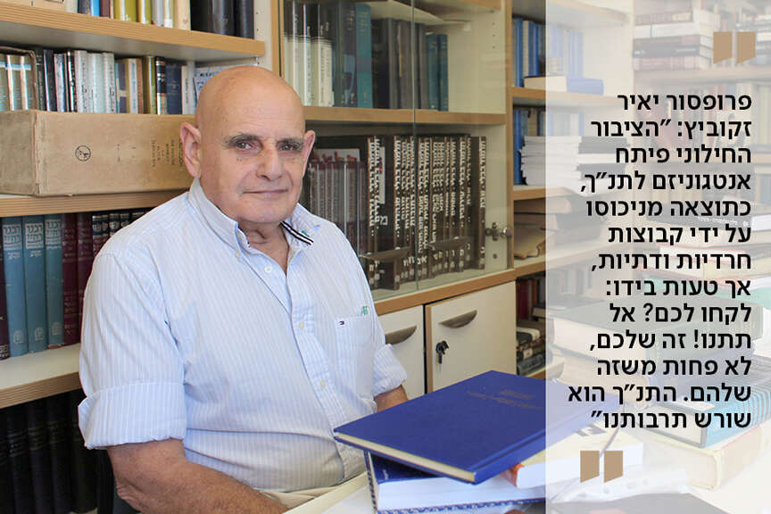 פרופ' יאיר זקוביץ הוא מאלה שמתייחסים לתנ"ך וגם לציבור לומדיו הפוטנציאלי ברצינות, בהכי רצינות שאפשר. הוא משליך מהרנסנס שחווה לאחרונה דגל ישראל - כאשר אומץ על ידי כל הצדדים למחלוקת על הרפורמה המשפטית - לרנסנס דומה שאולי יחווה בעתיד גם התנ"ך. "אולי אחרי הדגל יגיע גם תורו של התנ"ך", הוא ספק מעריך, ספק מקווה, "ואז יובהר סוף־סוף שהתנ"ך הוא נכס של הכלל, שאינו שייך רק למחנה אחד".