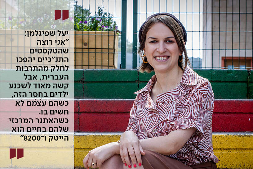"יש בתנ"ך הכל - חינוך, וערכים, ואקטואליה, וניתן באמצעותו גם לגעת בנפש. בעבר אנשים גם דיברו בשפת התנ"ך. כשאני חושפת בפעם הראשונה את התלמידים שלי למילים מהשיר הידוע של נעמי שמר: 'כַּד הַקֶּמַח לֹא תִכְלָה וְצַפַּחַת הַשֶּׁמֶן לֹא תֶחְסָר', שנלקחו ממלכים א', או אפילו לטקסט מהשיר 'הלוואי' של בועז שרעבי, שעושה שימוש ב'לֹא יִשָּׂא גוֹי אֶל גּוֹי חֶרֶב' מספר ישעיהו, זה לא אומר להם דבר.