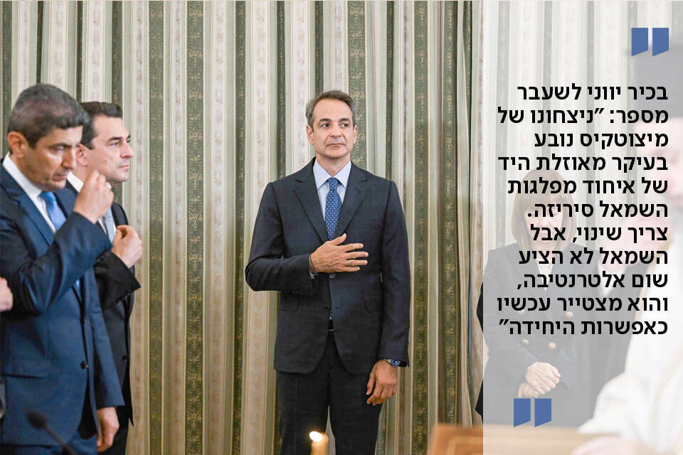 ב־2019 גבר מיצוטקיס על יריביו במפלגה והתמודד בבחירות מול איחוד מפלגות השמאל סיריזה בראשות אלקסיס ציפראס. זאת היתה תחילת המפלה של השמאל ביוון. "ניצחונו של מיצוטקיס אז, וביתר שאת נצחונו הגורף עכשיו", אומר בכיר לשעבר בממשל, שהעדיף לדבר בעילום שם, "נובע בעיקר מאוזלת היד של סיריזה ומחולשתה של המפלגה הסוציאל־דמוקרטית היוונית פאסוק, שהפכה ממפלגת שלטון חזקה למפלגה קטנה וחסרת השפעה. נכון שצריך שינוי, אבל השמאל לא הציע שום אלטרנטיבה למהלכים של מיצוטקיס, והם מצטיירים עכשיו בתור אפשרות יחידה.