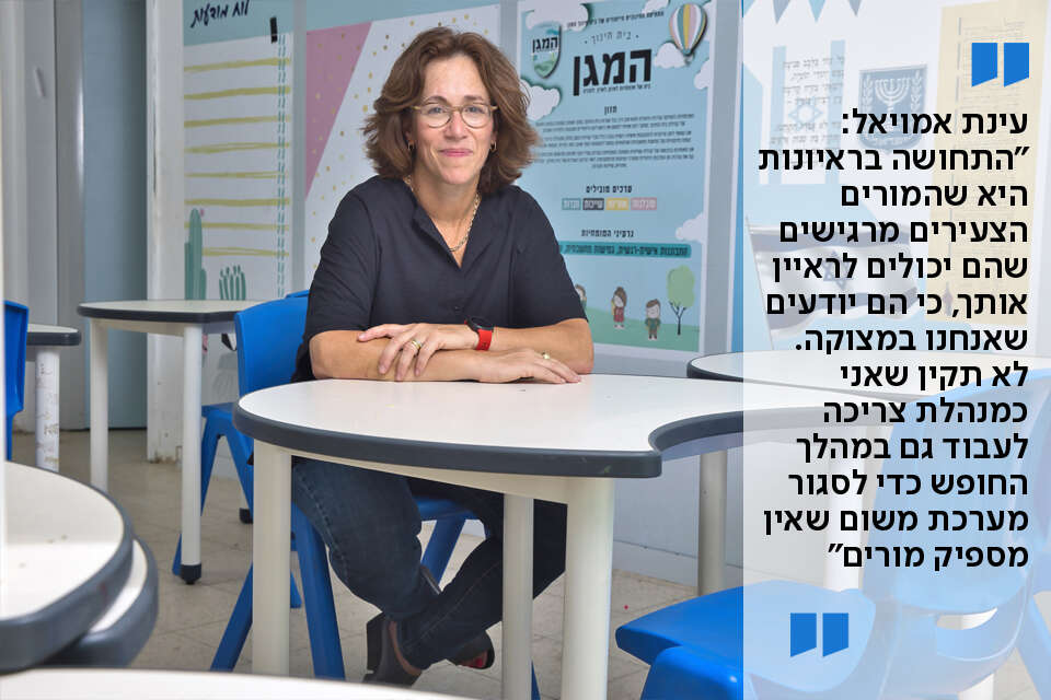 "מצבת המורים שלי מלאה, אבל זה רק בזכות פתרונות יצירתיים", אומרת עינת אמויאל (49, נשואה ואם לשלוש), שמנהלת כבר שמונה שנים את בית החינוך "המגן", "יש לי מחסור במורה לאנגלית במשרה מלאה, ובמורה לאמנות. בשנה שעברה ניסינו להעסיק סטאז'רים, אבל זה לא עבד טוב, לא להם ולא לנו. אז השנה ביקשתי מרכזת האנגלית שלי, שהיא מורה מצוינת עם המון ניסיון, לקחת שתי מורות שדוברות אנגלית ברמת שפת אם, ולתת להן הכשרה מזורזת להוראת אנגלית. בשנה שעברה עשיתי דבר דומה עם מחנכת שלימדה מתמטיקה, אחרי שעברה הכשרה פנימית שלנו".