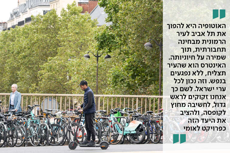 "כן, זו האוטופיה - להפוך את תל אביב, למשל, לעיר הרמונית מבחינה תחבורתית, כזו שתאפשר מגוון אפשרויות תחבורתיות, תוך שמירה על החיוניות שלה כמרכז כלכלי ותרבותי תוסס. האינטרס שלנו הוא שהעיר תצליח, כמובן, ללא נפגעים בנפש. יש ערים באירופה, כמו הלסינקי, ששם אפס הרוגים בכבישים הוא יעד ריאלי. זה חלק ממדיניות האיחוד האירופי ל־2050".