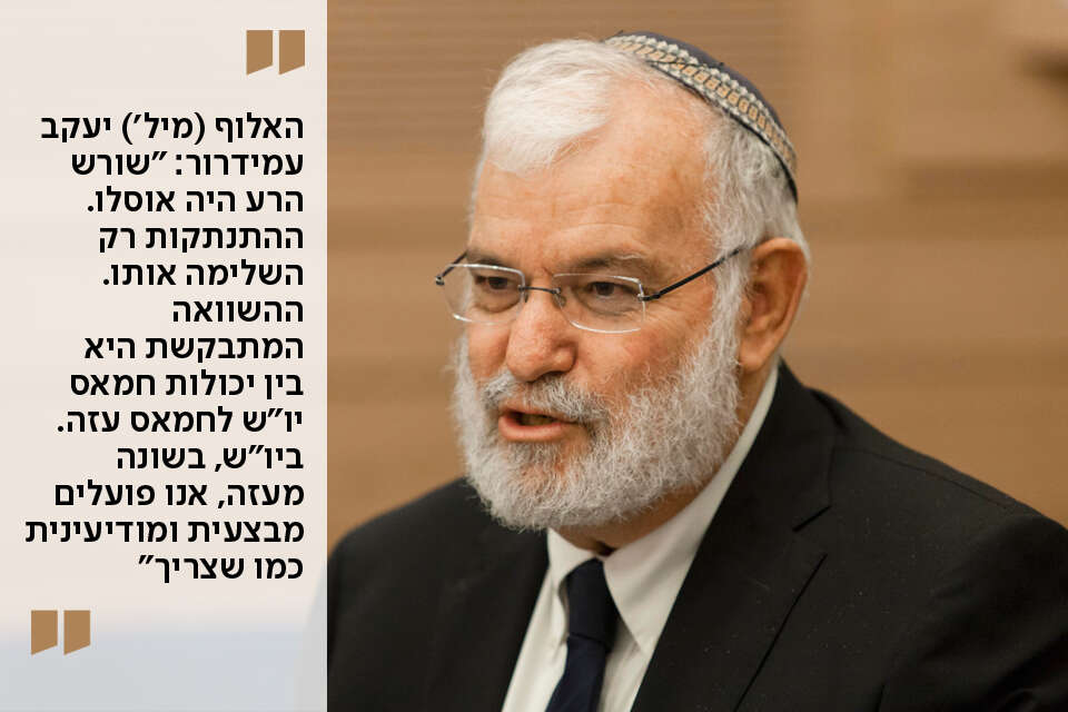 האלוף (מיל') יעקב עמידרור, לשעבר ראש המטה לביטחון לאומי, סבור ששורש הרע היה אוסלו. ההתנתקות רק השלימה את מה שהחל שם. ההשוואה המתבקשת, לדבריו, היא בין חמאס יו"ש לבין חמאס עזה. "חמאס ביו"ש יכול מדי פעם להרוג שניים, שלושה, ארבעה יהודים, לירות על רכב, לדקור, לדרוס. חמאס בעזה פועל בשטח שבו איננו נוכחים ומוגבלים בפעולות מבצעיות ומודיעיניות. עד 2002 יו"ש היתה כמו עזה. ל'חומת מגן' יצאנו אחרי 122 הרוגים בחודש אחד וכבשנו מחדש את יו"ש. לקח ארבע שנים לנקות אותה, ועד גל הטרור האחרון לפני כשנה היו לנו שם 15 הרוגים בממוצע בשנה. בעזה איבדנו את היכולת המודיעינית והמבצעית כבר באוסלו, וכבר אז הוכח שאם אינך שולט בשטח, לא ניתן לעבוד בשיטת מכסחת הדשא שבה אנו עובדים ביו"ש. המסקנה האסטרטגית מהמהלך של הנסיגה מגוש קטיף היא שאין שום יכולת להבטיח את ביטחונה של מדינת ישראל משטחים שמהם נסוגה".