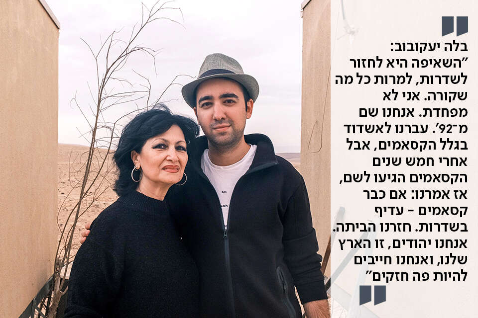 "השאיפה היא לחזור לשדרות, למרות כל מה שקורה. אני לא מפחדת. אנחנו שם מ־92'. עברנו לאשדוד בגלל הקסאמים, אבל אחרי חמש שנים הגיעו הקסאמים לשם, אז אמרנו: אם כבר קסאמים - עדיף בשדרות. חזרנו הביתה. אנחנו יהודים, זו הארץ שלנו, ואנחנו חייבים להיות פה חזקים. עליתי מאוזבקיסטן כי שם שרפו לנו את הבתים, וגם שם היו מחבלים. ברחנו כי זה לא שלנו, אבל פה זה שלנו, אי אפשר לברוח. שמעתי אנשים שרוצים לעזוב עכשיו את שדרות, זאת טעות גדולה".