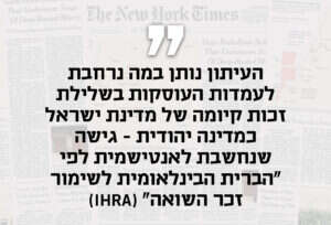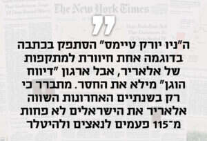 הנה היבול החודשי של העיתון "ניו יורק טיימס": כתבת מגזין ארוכה על יהודים אמריקנים שהפסיקו לתמוך בישראל; סרט תיעודי באתר האינטרנט של העיתון, שבו חיילים לשעבר, ובהם דין יששכרוף מ"שוברים שתיקה", מספרים שברוך מרזל מחלק להם קופונים לפיצה אם הם יורים בפלשתינים בחברון; מאמר נגד חוקים אמריקניים שנועדו להגן על ישראל מפני ה־BDS; ומאמר שמאשים את ישראל בהשתקת החברה האזרחית הפלשתינית בגלל ההחלטה להכריז על כמה ארגונים פלשתיניים כארגוני טרור.