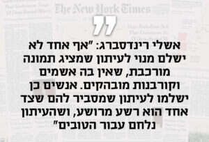 המסקנה שעולה מהתבוננות בטיפול של ה"ניו יורק טיימס" בישראל היא שמבחינת העיתון, יש שני סוגים של יהודים: יהודים "טובים", שממלאים את התפקיד המסורתי שמילאו יהודים בחברה המערבית בעשורים האחרונים, בעיקר בשדה התרבותי והאינטלקטואלי - מוודי אלן ופיליפ רות, ועד מדענים וזוכי פרס נובל. היהודים האלה יכולים להיות גאונים, אבל הם נטולי כוח או עוצמה פוליטית. הם אינם מאיימים על אף אחד, או במילותיו של רינדסברג, "כל עוד מדובר בהצגות תיאטרון ביידיש או במתכונים של מרק עם קניידלך - אין ל'ניו יורק טיימס' בעיה".