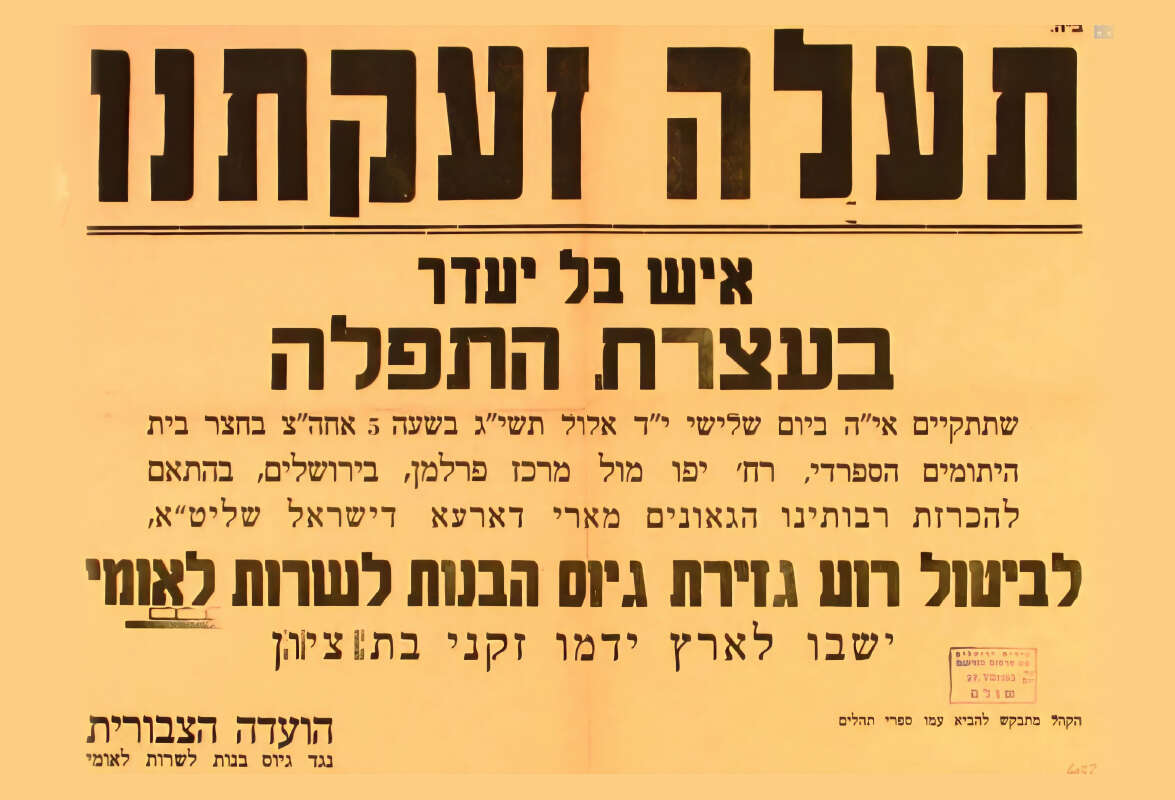 באמצע אוגוסט 1952 עלתה מחדש שאלת גיוס בנות דתיות, בעקבות תלונות שהגישו הסיעות החרדיות בקואליציה בנוגע להתנהלות ועדות הפטור משירות. "הוועדות לא מצליחות להבחין בין דתיות המצהירות הצהרת אמת לבין אלה שלא, וכבר קרה שבנות חרדיות גויסו", אמר שר הסעד, הרב לוין, מאגודת ישראל, במפגש עם בן־גוריון. בתגובה הודיע ראש הממשלה ש"בקרוב יימסרו הנחיות חדשות בנוגע לוועדות הפטור". בינתיים, הפיץ ארגון בשם "הוועדה הציבורית נגד גיוס בנות" כרזה (בצילום), הקוראת לציבור להגיע ל"תפילת מחאה" בירושלים בנושא הנפיץ.