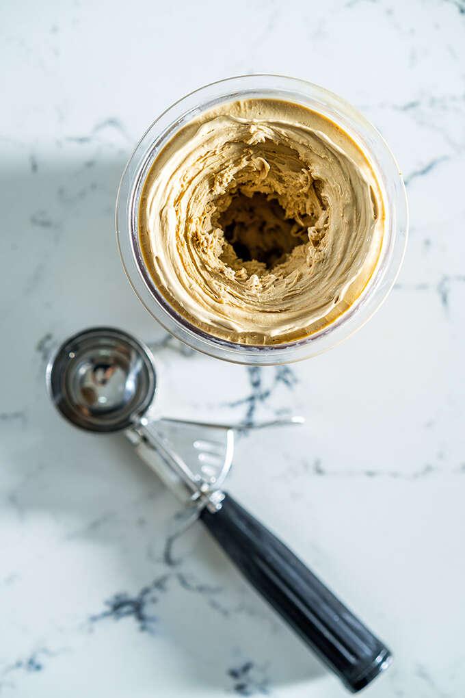 7. מוציאים את המסה הקפואה ומערבלים במכשיר בתוכנית גלידה לקבלת מרקם קרמי מושלם. ניתן גם לאכול ללא ערבול נוסף.