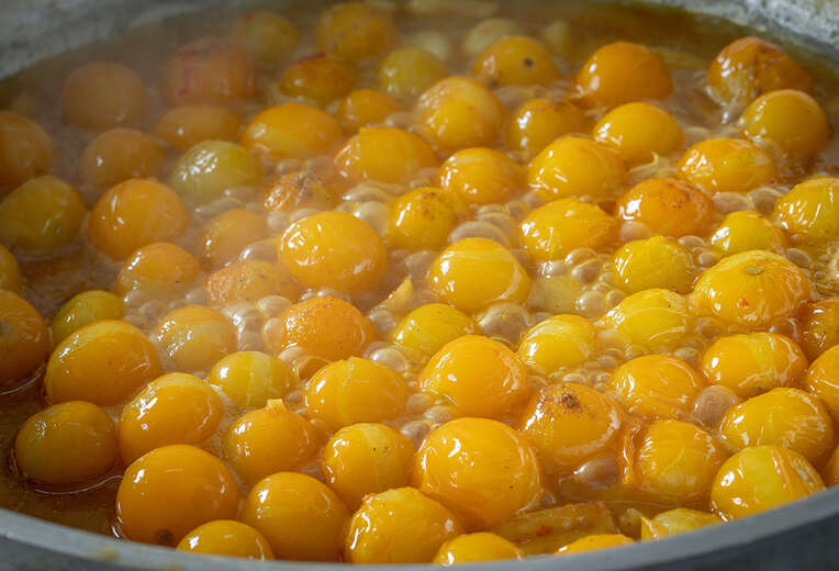 4. מוסיפים את עגבניות השרי והלימון הכבוש ומטגנים על להבה בינונית למשך כ־10 דקות.