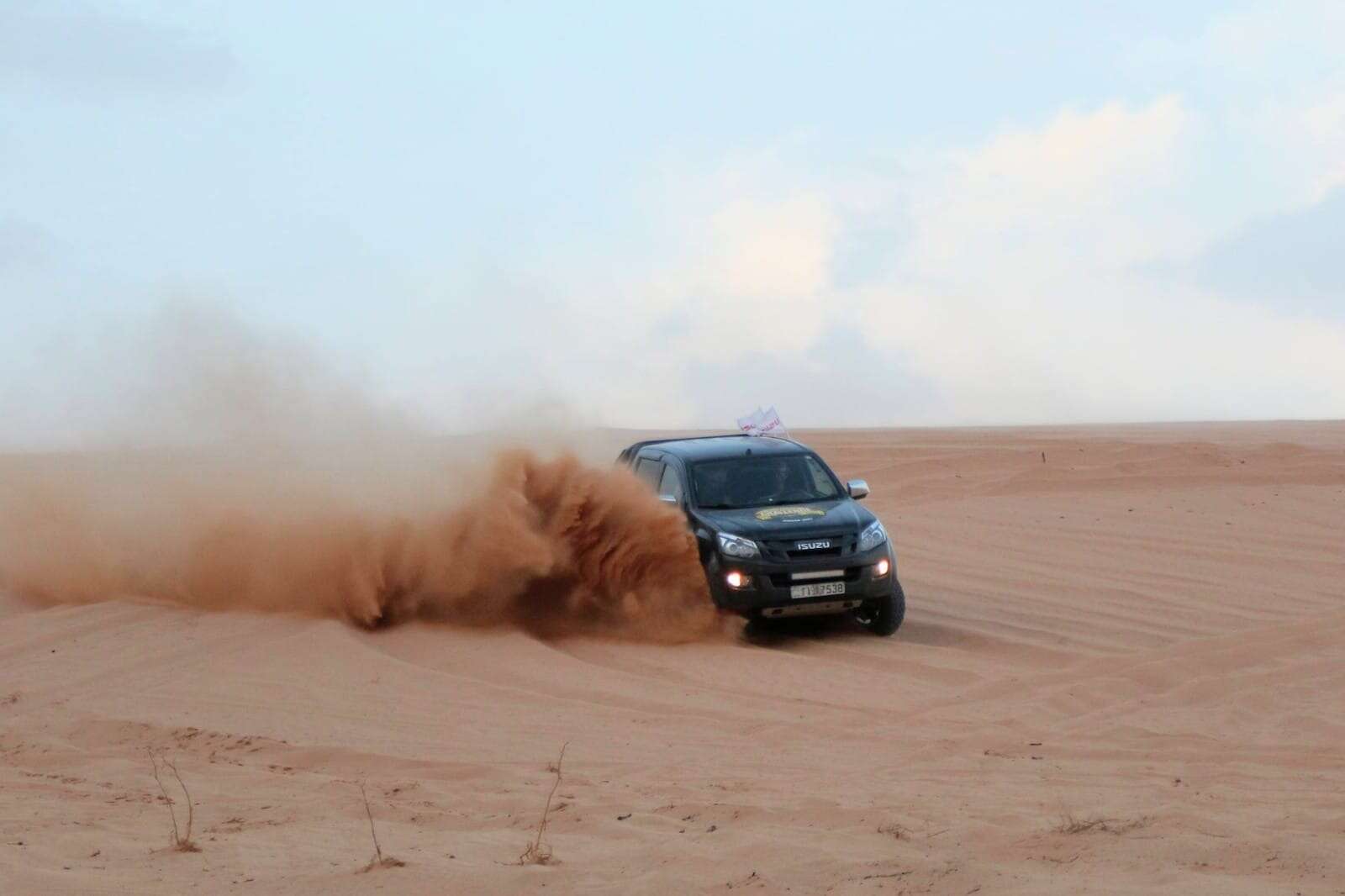 עד מהרה מתחילים לשקוע ולהתחפר בחול הטובעני. "בישראל רוב המדבר והנגב בנויים משבילים טרשיים וסלעיים, ולכן הנהג הישראלי פחות מורגל בנהיגה בדיונות חול, שמצריכות דגשים מסוימים" מסביר אוגש תוך שהוא ושאר המשתתפים מסייעים בחילוץ הרכבים התקועים. "חובה להוריד את לחץ האוויר בגלגלים, ואסור לעצור בעלייה מחשש להתחפרות. יש להתחיל תמיד נסיעה בגלגלים ישרים". כל מחולץ מיישם את הדגשים של אוגש ויוצא מייד לסבב נוסף על הדיונות שהפעם נראה אחרת לגמרי. הטנדרים כובשים את הדיונה בקלות עד שנדמה כי הם מרחפים מעל החול המדברי האדום