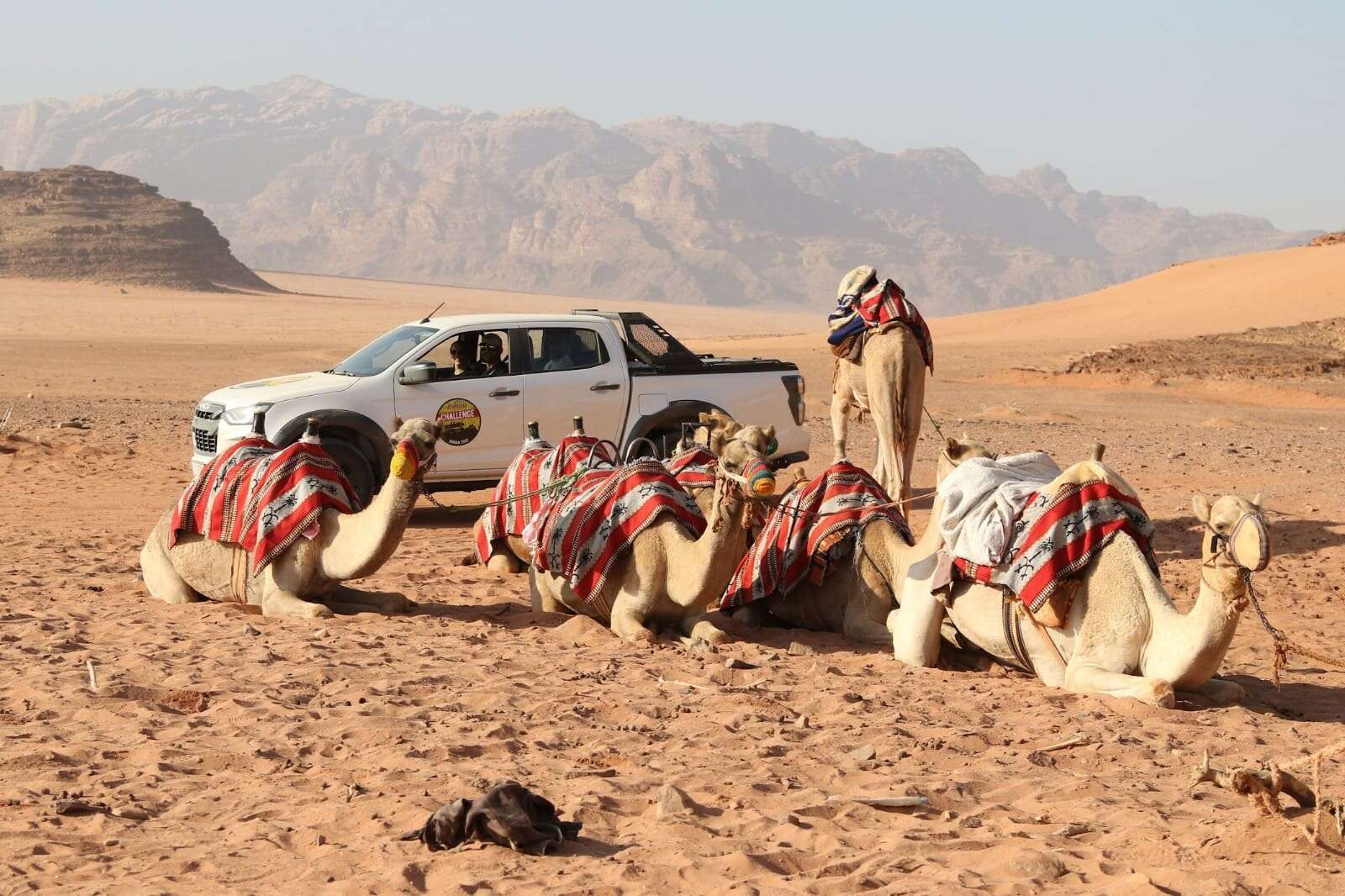 בתום ביקור קצר בפטרה, אנחנו נוסעים על דרך המלך העתיקה, שחיברה בעבר בין מצרים לדמשק, וחוצים את קו פרשת המים של מצוק ההעתקים הירדני אל עבר המדבר הדרומי של ירדן. המדבר מתאפיין בשבילים חוליים ובסלעים מאבן חול נובית בגוונים אדומים, שמקורה במדבר נוביה שבסודן ובמצרים. הטנדרים מפתיעים לטובה ומספקים חווית נהיגה מפנקת ברמה כזאת שגם את הקפיצות והטלטולים הרבים שהדרך מזמנת לנו, אנחנו כמעט ולא מרגישים.