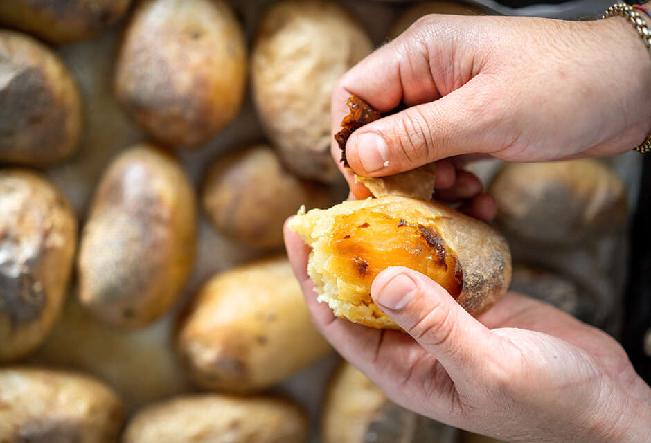 3. לאחר האפייה מקלפים את תפוחי האדמה כשהם חמים ומועכים לפירה חלק.