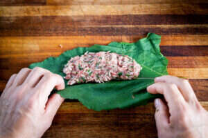 5. שמים מהמילוי על חצי עלה (לאורך) וסוגרים את החצי השני של העלה מעל.