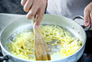 3. מטגנים את הבצל במחבת רחבה או בסיר עד שיזהיב.