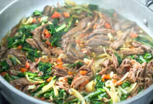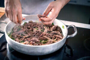 2. לאחר הבישול נותנים לבשר להתקרר ומפוררים ביד לחתיכות גדולות.