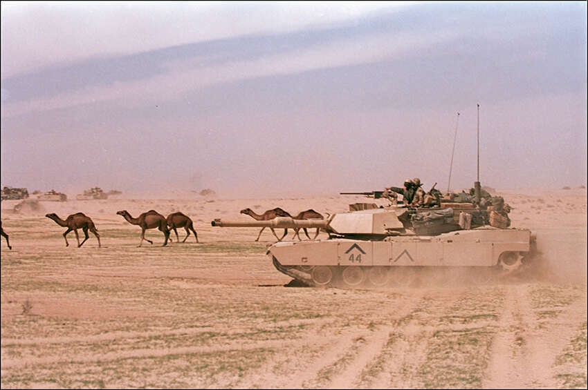 מלחמת המפרץ היתה אירוע ידוע מראש, עם האולטימטום המפורסם שהציבו בעלות הברית לסדאם חוסיין. טננבאום, שידע כי כל התקשורת העולמית עומדת להצטרף לכוחות, חיפש את הזווית המעניינת - וכדרכו גם מצא אותה. "היינו בכווית הרבה אנשי תקשורת, ואני החלטתי שאני משיג ג'יפ ומצטרף לכוחות של צבא ארה"ב. בדרך־לא־דרך, ביחד עם עיתונאי הולנדי, הצלחנו לעשות זאת ופשוט נסענו ליד הכוחות שהתקדמו במדבר. התמונה שצילמתי מסמלת עבורי את שתי 'ספינות המדבר' שחברו יחד - הגמלים עם הדבשת, שלא בדיוק הבינו מה נחת עליהם, ומכונות המלחמה עשויות הפלדה ששעטו קדימה".