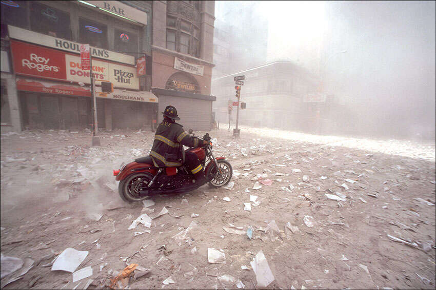 "מולי רצו המוני בני אדם שברחו מהתופת, אבל אני רצתי לתוכו. צילמתי המון תמונות בפיגוע הזה, ובהן של המטוס השני פוגע במגדל ושל הבניינים עולים באש. אבל תמונה אחת נחרתה בזיכרוני במיוחד, של לוחם האש טים דאפי, שהיה בביתו כשאירע הפיגוע, עלה על הציוד הכבד ורכב לזירה על ההארלי דיווידסון שלו כדי לסייע לאזרחים. לאחר מכן נפגשתי עם טים וגם הפכנו לחברים".
