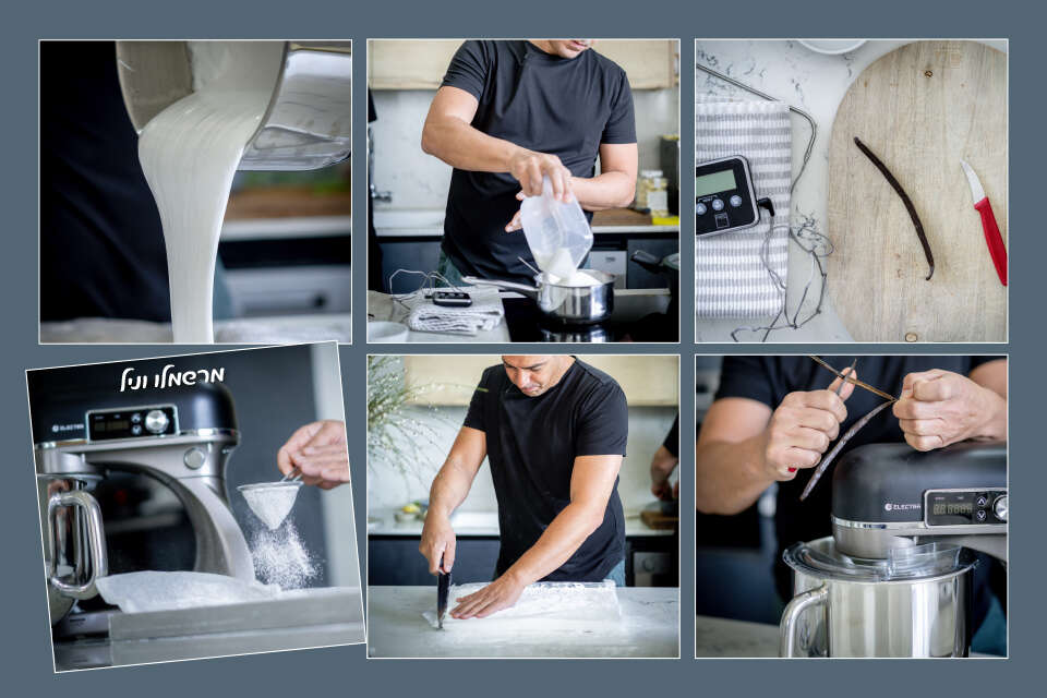6. כשהסיר הגיע לטמפרטורה הרצויה, מוסיפים את תכולתו לקערת המיקסר ומערבלים בעדינות עד שהג'לטין נמס. מייד לאחר מכן מגבירים למהירות מקסימלית ומקציפים