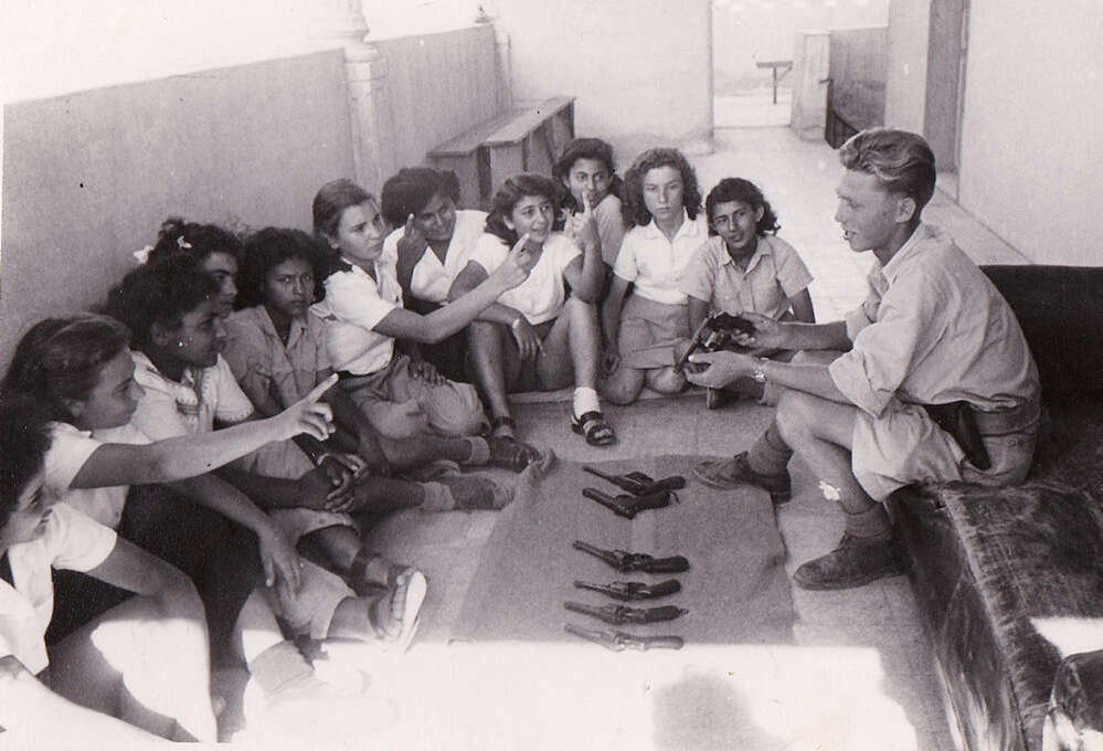 תלמידות צעירות משתתפות בשיעור הדרכת נשק על גג בשייח' מוניס בפאתי תל אביב, מאי 1948