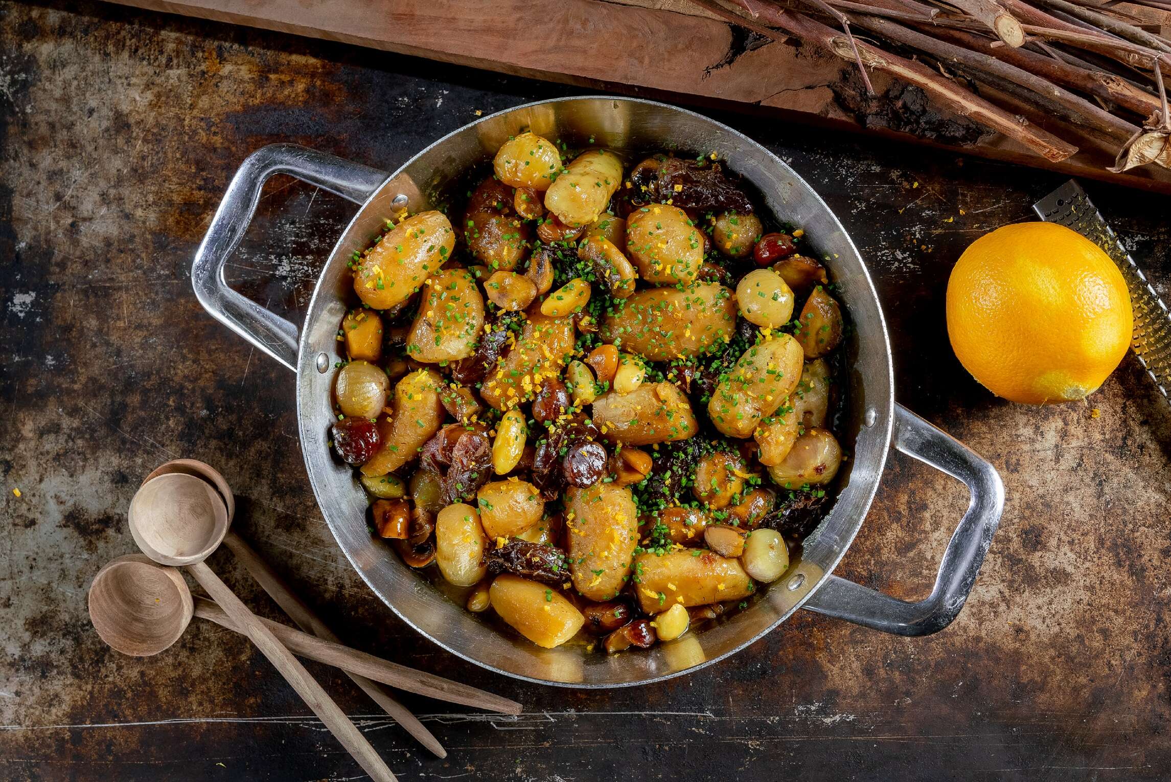 מבשלים את הארטישוק הירושלמי במים במשך שעה, עד ריכוך. מטגנים את הבצלצלים, הפטריות והשום במחבת רחבה או בסיר, עד השחמה. מוסיפים את הערמונים, את הארטישוק הירושלמי ואת שאר המרכיבים ומבשלים שעה נוספת. בהגשה, מפזרים מעל קליפת תפוז מגוררת ועירית קצוצה.