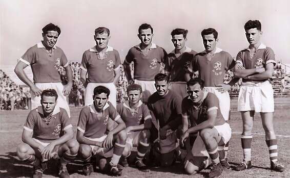 השנאה בין קבוצות הפועל, שנתמכו בידי מפא"י וההסתדרות, לבין קבוצות מכבי, שבהן תמכו אנשי הבורגנות העירונית, גרמה להשבתת הליגה בכדורגל. בעקבותיה הזמינו מרכזי הספורט קבוצות מחו"ל לצורך קיום משחקי ידידות בארץ. משחק ראשון התקיים ב־19 בנובמבר 1950 במגרש "באסה" (לימים אצטדיון בלומפילד), ובו מחזיקת הגביע השבדי, א.י.ק, הביסה את הפועל תל אביב (בצילום) 0:4. ב־1951 יושרו ההדורים בין מרכזי הספורט, והליגה שבה לפעילותה. עומדים (מימין): רחביה רוזנבוים, אשר בלוט, חיים גלזר, יהושע זילברשטיין, אדמונד שמילוביץ' ומשה מלמד. כורעים: בוצ'קה פלמן, יעקב חודורוב, ישראל וייס, שמעון צימרמן ודוד שווייצר